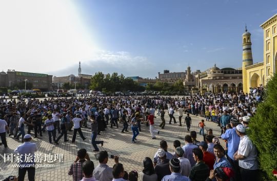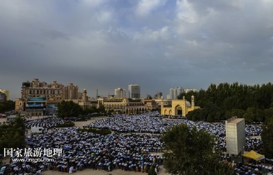 當(dāng)日,近3萬(wàn)名各族穆斯林群眾前往新疆最大清真寺——艾提尕爾清真寺做禮拜,喜迎開齋節(jié)。