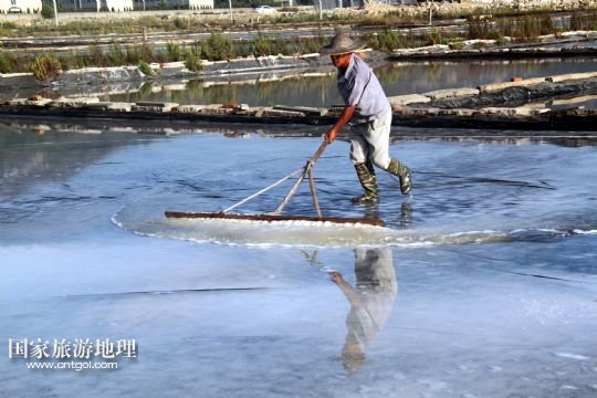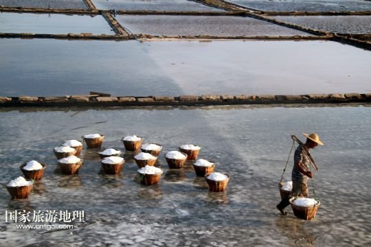 國(guó)家旅游地理 浙江臺(tái)州8月10日訊 8月10日,在浙江溫嶺市石塘鎮(zhèn)蒼岙鹽場(chǎng),一名鹽工頂著太陽(yáng)在鹽田里把曬好的鹽收集起來(lái)挑到鹽堆去。連日來(lái),浙江省溫嶺市石塘鎮(zhèn)蒼岙鹽場(chǎng)的鹽工利用晴熱天氣忙著曬鹽。對(duì)于浙江的曬鹽人來(lái)說(shuō),夏季陽(yáng)光最猛烈的7月、8月、9月這三個(gè)月是他們勞作的黃金季節(jié)。天氣越炎熱,光照越猛烈,曬鹽效果就越好。炎熱的夏天艷陽(yáng)高照,而曬鹽人卻要頂著高溫出門(mén)勞作。 /新華社發(fā)(梁敏慧 攝)