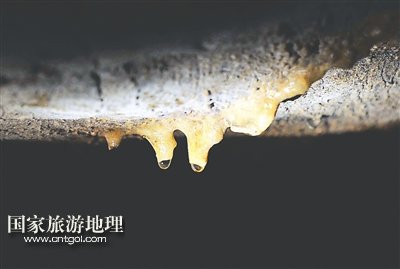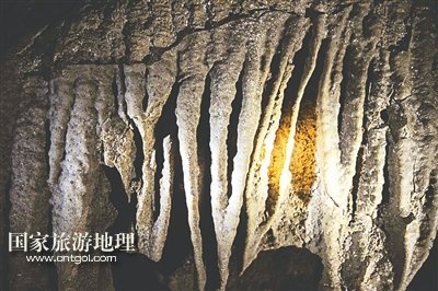 離開(kāi)前洞,順路蜿蜒3公里至后洞,洞口依舊狹小,僅能1人由吊繩垂入約2米著地,斜向下行約5米,石鐘乳洞豁然開(kāi)朗,約500米見(jiàn)方,地面較為平坦,前壁有一紅色“龍形”圖案,頭頂石壁還有一匐匍向前的倒掛石龜,其旁?huà)熘淮?ldquo;葡萄”狀鐘乳石……