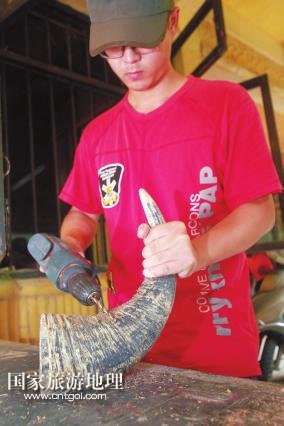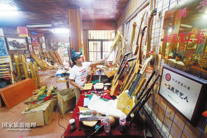 國(guó)家旅游地理 廣西柳州11月11日訊(記者陸旺楊春) 牽手漫步龍?zhí)睹琅希⒓缈勘炽逶⊥砬锱?yáng),你會(huì)時(shí)常聽(tīng)到一串串動(dòng)人的音符:它時(shí)而渾厚圓潤(rùn)、清脆響亮,時(shí)而輕靈縹緲、悠長(zhǎng)凄美。不忍打破這份寂靜閑情,卻又忍不住猜想:這是何方人士,用何種樂(lè)器,吹拉彈撥出如此佳音?穿越叢林,循聲走去,瑤寨庭前,幾個(gè)年輕男女手握蘆笙,身子左搖右晃,吹得正起興。步入瑤寨一樓才發(fā)現(xiàn),這里儼然一個(gè)生產(chǎn)民族樂(lè)器的大工廠:木板、竹竿、鐵鋸、膠水、油漆,以及形狀酷似牛頭、牛腿、魚(yú)身、龍身等顏色各異、五花八門的樂(lè)器……一位正在給樂(lè)器上漆的中年人梁志榮告訴記者,這是龍?zhí)豆珗@正在籌建的民族樂(lè)器館,也是魚(yú)峰區(qū)創(chuàng)建廣西文化強(qiáng)區(qū)的特色景區(qū)之一,他現(xiàn)在是大龍?zhí)睹褡逅囆g(shù)團(tuán)團(tuán)長(zhǎng),研究、制作民族樂(lè)器將近20年,曾獲“廣西民間工藝大師”和“十佳民間藝人”稱號(hào)。