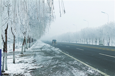 12月23日,銀川永寧快速通道兩旁呈現(xiàn)“霧凇”美景。據(jù)了解,霧凇俗稱樹掛,是一種冰雪美景。它是由于霧中無數(shù)零攝氏度以下而尚未結(jié)冰的霧滴隨風(fēng)在樹枝等物上不斷積聚凍粘的結(jié)果。霧凇現(xiàn)象在我國北方是很普遍的。記者 吳春霖 攝
